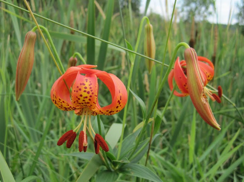 Turk's cap lilies, exotic and vividly orange, are growing along a marsh just outside town: