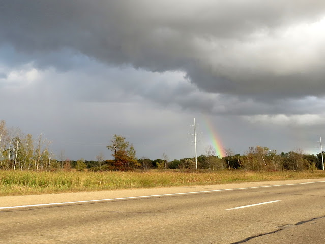 One last photo, taken from the car on the last day of September, when a stunningly vivid double rainbow arched over the town where I work, fading and reappearing several times. I caught the last of it on my drive home that evening: